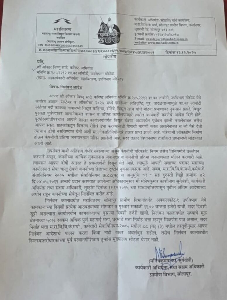 महावितरणचे लांबोटीचे कनिष्ठ अभियंता ओंकार साठे यांचे अखेर निलंबन .
