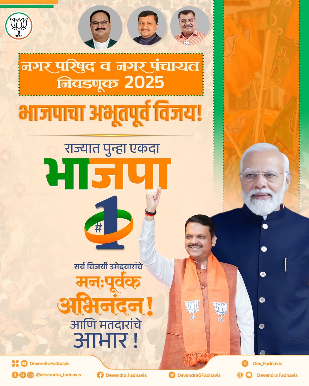 हा विजय म्हणजे विकास, सुशासन आणि जनतेच्या अपेक्षांना न्याय देणाऱ्या राजकारणाचा कौल असून, आगामी काळातही राज्याच्या प्रगतीसाठी भाजप कटिबद्ध राहील, असा विश्वास पक्ष नेतृत्वाने व्यक्त केला आहे.