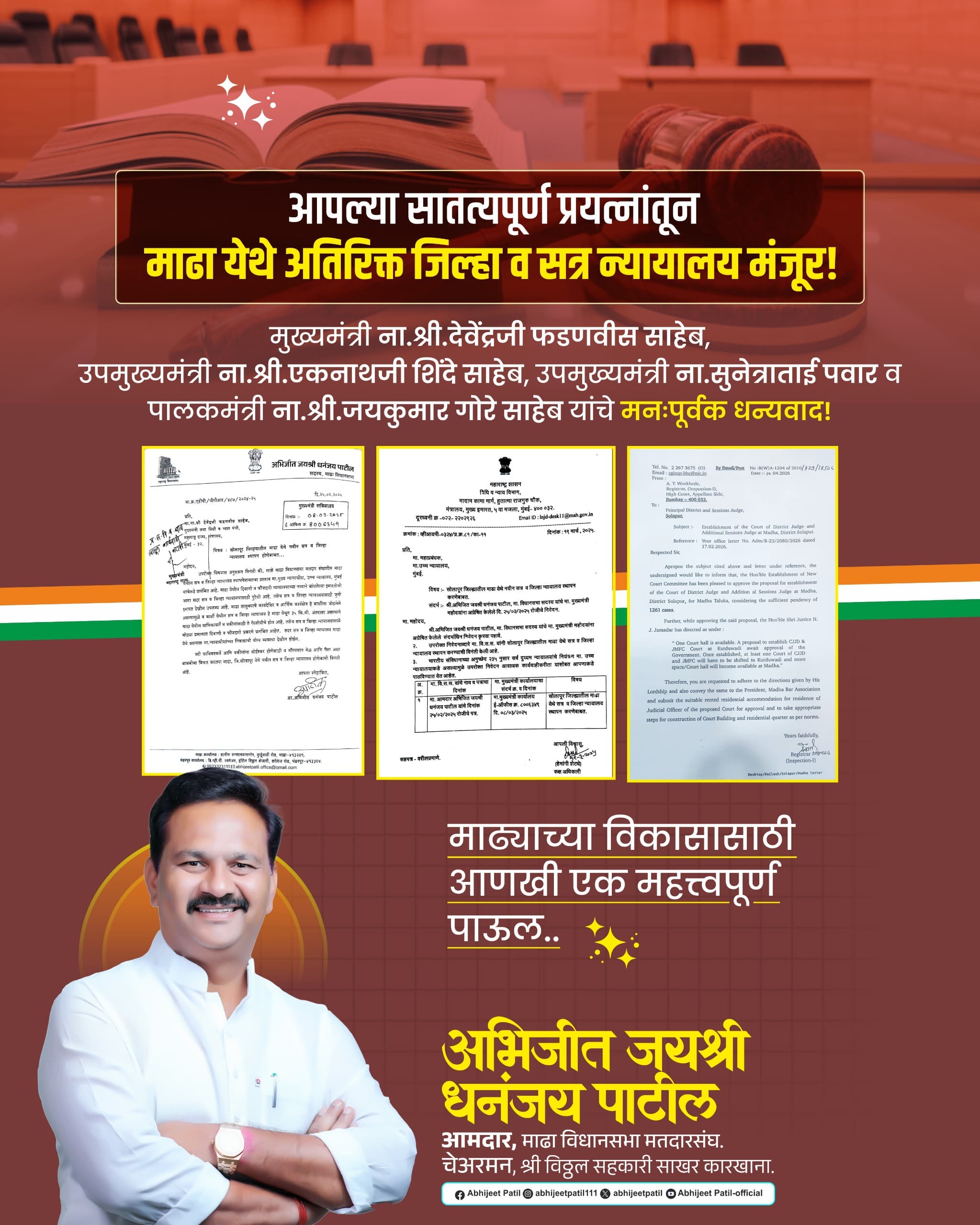 या ऐतिहासिक निर्णयाबद्दल माढा शहर आणि तालुक्यातील नागरिक, वकील संघ आणि राजकीय कार्यकर्त्यांनी आमदार अभिजीत पाटील यांचे विशेष आभार मानले आहेत.