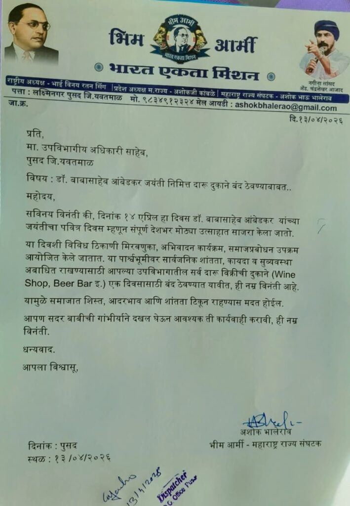 यासंदर्भात भिम आर्मी भारत एकता मिशन च्या वतीने उपविभागीय अधिकारी पुसद यांना निवेदन देण्यात आले. निवेदनात नमूद करण्यात आले आहे की, जयंती दिवशी मोठ्या प्रमाणावर मिरवणुका, अभिवादन कार्यक्रम आणि समाजप्रबोधन उपक्रम राबविले जातात. अशा वेळी दारू विक्री सुरू असल्यास अनुचित प्रकार घडण्याची शक्यता नाकारता येत नाही.त्यामुळे प्रशासनाने योग्य ती दखल घेऊन १४ एप्रिल रोजी सर्व वाईन शॉप, बीअर बार आदी दारू विक्री केंद्रे बंद ठेवण्याचे आदेश द्यावेत, अशी मागणी करण्यात आली आहे.